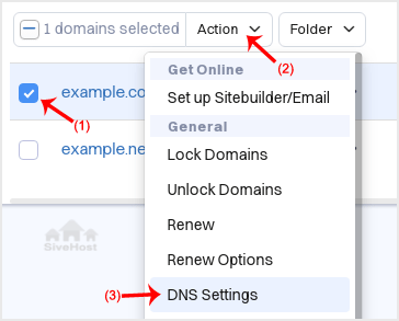 4. Check the box next to your domain name(s) and click on the DNS Settings from the Action menu.