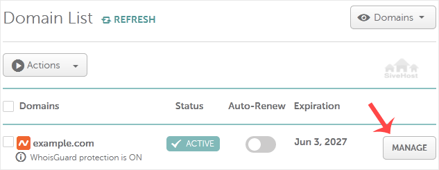 3. Under Domain List, locate your domain and click Manage next to it.