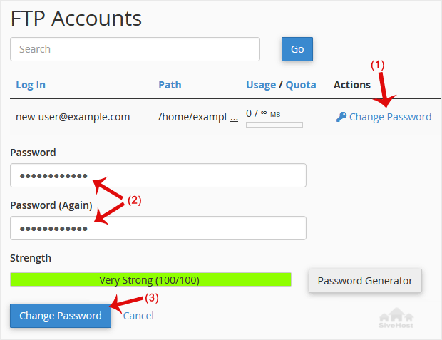 3. Under the list of FTP accounts, click on Change Password and enter a new password. Alternatively, use the password generator to generate one.